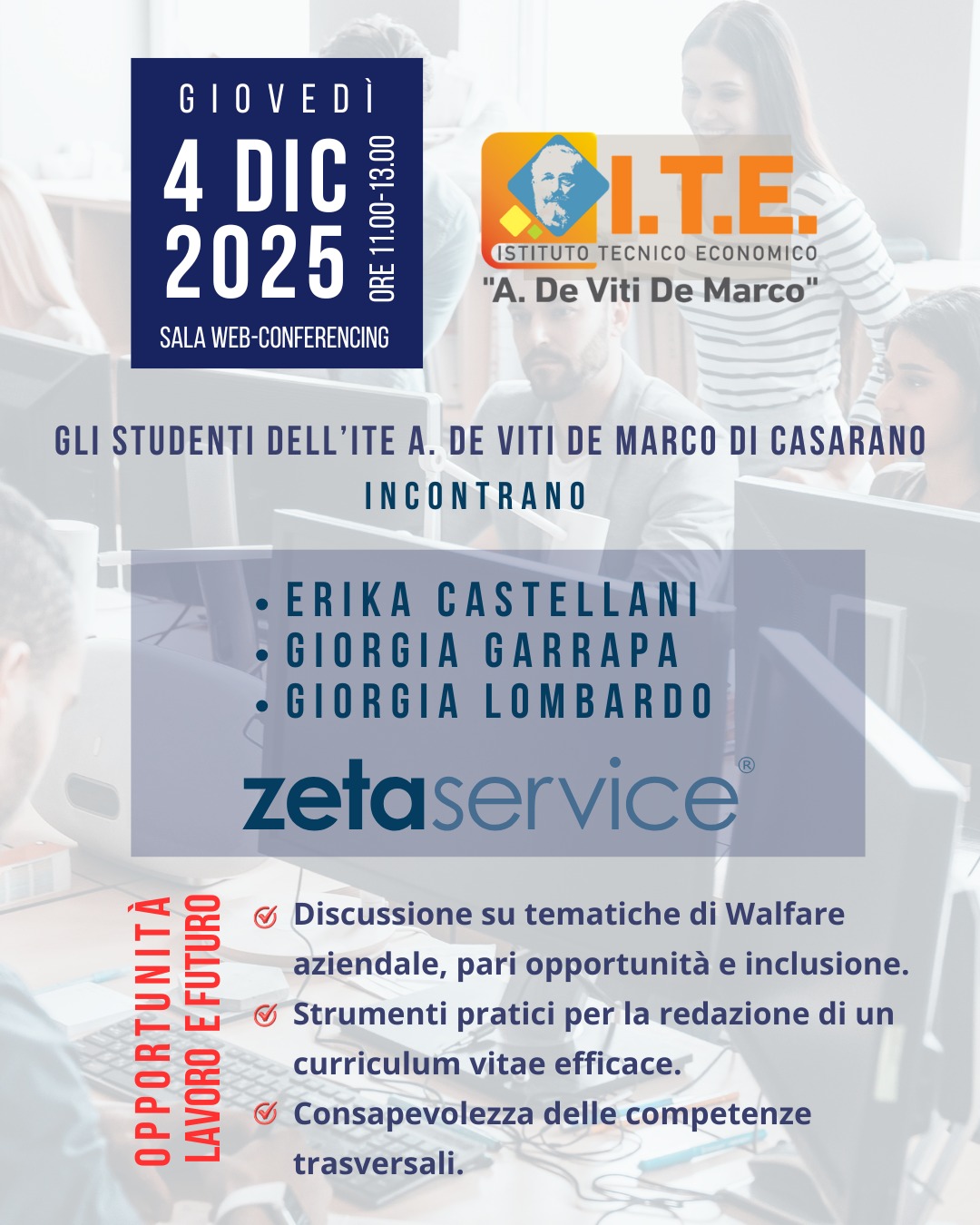 Giovedì 04/12/2025 i nostri studenti dialogheranno con gli esperti in gestione delle Risorse Umane dell’azienda Zeta Service.